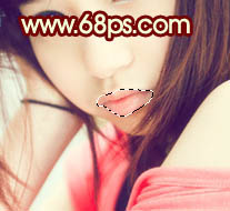 9、用钢笔勾出人物嘴唇部分的选区,如图16,按Ctrl + Alt + D 羽化1个像素后创建色彩平衡调整图层,参数设置如图17,简单的把嘴唇调红一点,效果如图18。