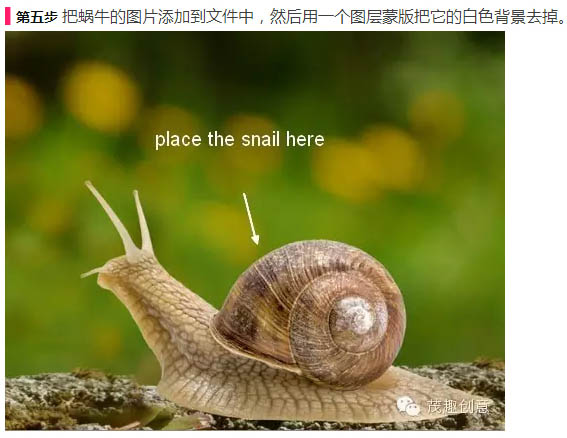 5、把蜗牛的图片添加到文件中,然后用一个图层蒙版把它的白色背景去掉。