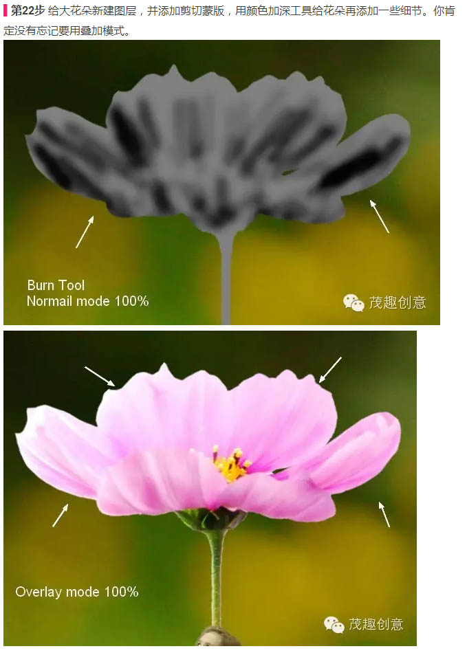 22、给打花朵新建图层,并添加剪切蒙版,用颜色加深工具给花朵再添加一些细节。你肯定没有忘记要用叠加模式。