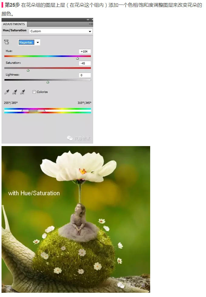 25、在花朵组的图层上层添加一个色相/饱和度调整图层来改变花朵的颜色。
