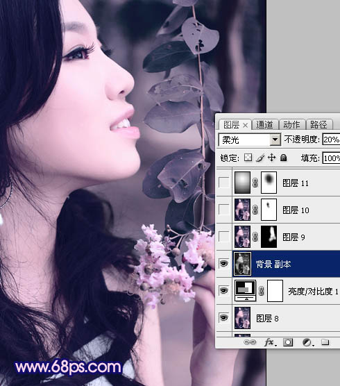 13、把背景图层复制一层,按Ctrl + Shift + ] 置顶,按Ctrl + Shift + U 去色,图层混合模式改为“柔光”,图层不透明度改为:20%,效果如下图。