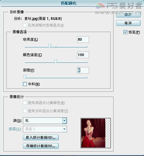2、执行:图像——调整——匹配颜色,设置见下图。