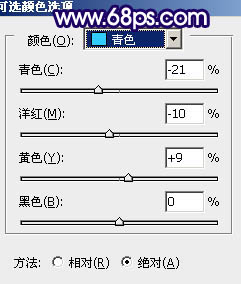 6、创建可选颜色调整图层,对绿色及青色调整,参数设置如图16,17,效果如图18。