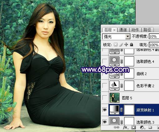 7、创建渐变映射调整图层,颜色设置如图19,确定后把图层混合模式改为“强光”,图层不透明度改为:10%,效果如图20。