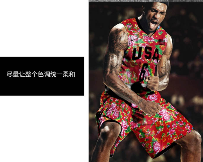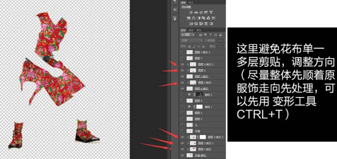 这里避免画布单一多层剪贴,调整方向,尽量整体先顺着原服饰走向处理,可以用变形工具。