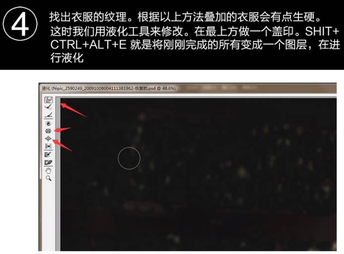 4、找出衣服的纹理。根据以上方法叠加的衣服会有点生硬。这时我们用液化工具来修改。在最上方做一个盖印。Shift