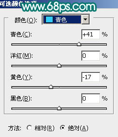 2、创建可选颜色调整图层,对青色调整,参数设置如图6,效果如图7。