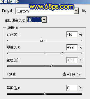 1、打开原图素材,创建通道混合器调整图层,对蓝色进行调整,参数设置如图1,效果如图2。这一步是快速把图片中的一些杂色消除。