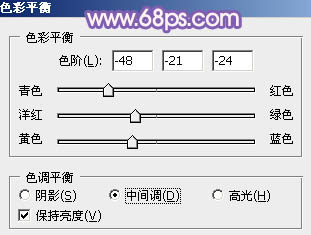 6、创建色彩平衡调整图层,对中间调进行调整,参数设置如图18,效果如图19。