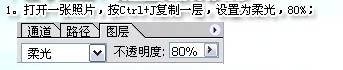 1、打开原图素材,按Ctrl + J 把背景图层复制一层,图层混合模式改为“柔光”,图层不透明度改为:80%。