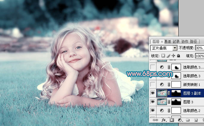 9、把当前图层复制一层,图层混合模式改为“正片叠底”,图层不透明度改为:30%,效果如下图。