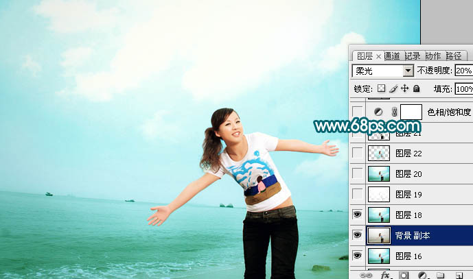 12、把背景图层复制一层,按Ctrl + Shift + ] 置顶,图层混合模式改为“柔光”,图层不透明度改为:20%,如下图。