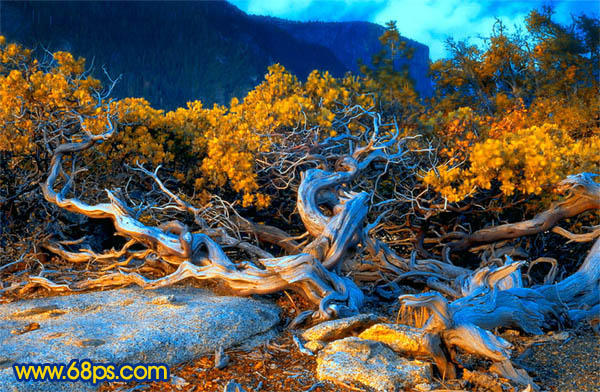 本教程的色调有点类似黄昏后的效果。调色的过程也比较简单。开始的时候我们需要把素材图的整体色调压暗,然后开始换色,把黄绿色调成鲜艳的橙黄色,白色部分调成蓝色,再协调好整体颜色皆可。