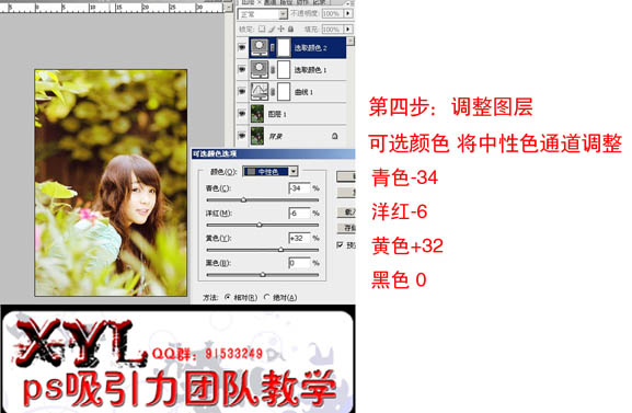 4、创建可选颜色调整图层对中性色调整,数值:青色:-34,洋红:-6,黄色:+32,黑色:0。