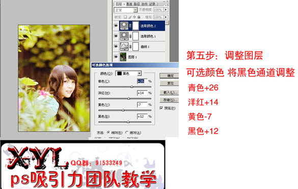5、创建可选颜色调整图层对黑色调整,数值:青色:+26,洋红:+14,黄色:-7,黑色:+12。