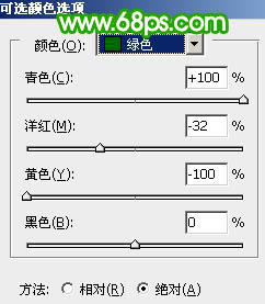 1、打开原图素材,创建可选颜色调整图层,对黄,绿调整,参数设置如图1,2,确定后用黑色画笔把人物部分擦出来,效果如图3。