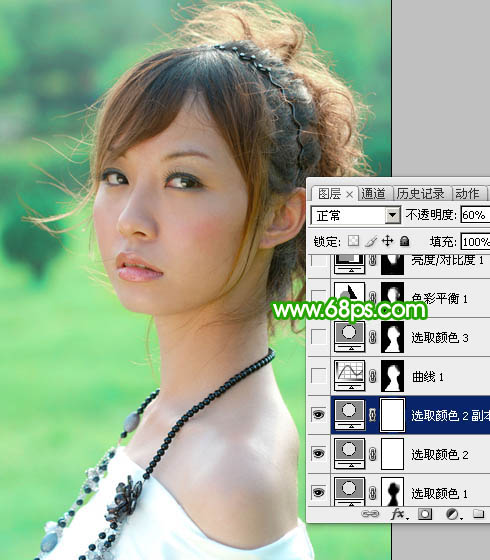 2、创建可选颜色调整图层,对绿色及青色调整,参数设置如图4,5,确定后把当前图层复制一层,图层不透明度改为:60%,效果如图6。