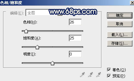 1、打开原图素材,创建色相/饱和度调整图层,先勾选“着色”选项,然后再调颜色,参数设置如图1,效果如图2。