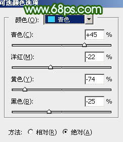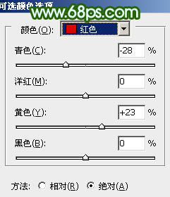 7、创建可选颜色调整图层,分别对红,黄,青调整,参数设置如图16 - 18,,确定后用黑色画笔把人物部分擦出来效果如图19。