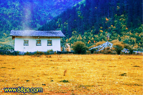 原图素材构成元素比较丰富,有草地、高山、房子等。可以根据需要把各部分单独调色,然后再组成多种颜色混合画面,色调可以自己任意组合。