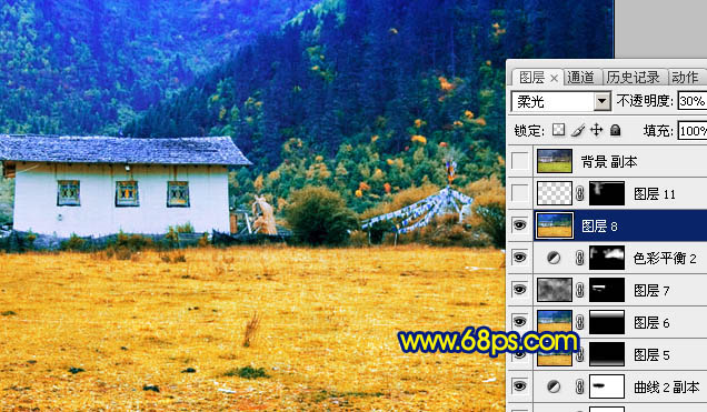 11、新建一个图层盖印图层,图层混合模式改为“柔光”,图层不透明度改为:30%,效果如下图。