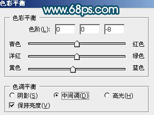 1、打开原图素材,创建色彩平衡调整图层,参数设置如图1,效果如图2。
