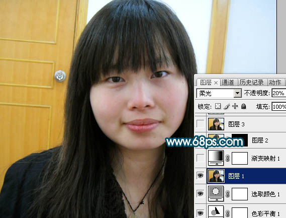 3、新建一个图层,按Ctrl + Alt + Shift + E 盖印图层。图层混合模式改为“柔光”,图层不透明度改为:20%。