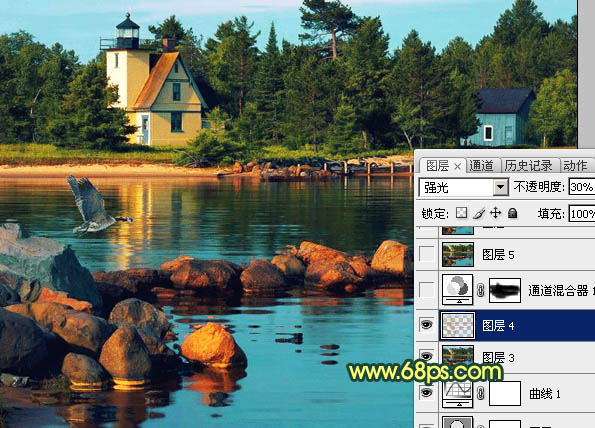 4、新建一个图层,按Ctrl + Alt + Shift + E 盖印图层。按Ctrl + Alt + 1 调出红色通道高光选区,如图12。按Ctrl + J 把选区部分的图像复制到新的图层,再把图层混合模式改为“强光”,图层不透明度改为:30%,效果如图13。