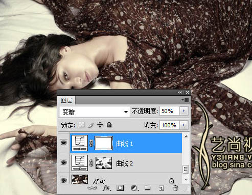 3、更改图层混合模式为“变暗”,图层不透明度改为:50%,如下图: