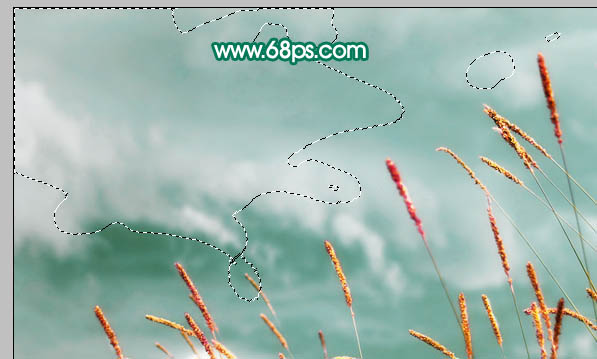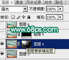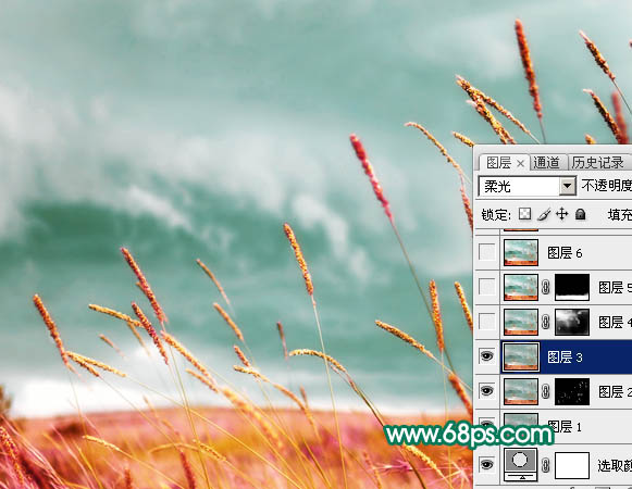 6、新建一个图层,盖印图层。图层混合模式改为“柔光”,如图11。按住Alt 键添加图层蒙版,选择白色画笔把图12所示的主要云彩部分擦出来,效果如图13。