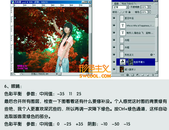 15、用钢笔勾出眼睛部分的选区,创建色彩平衡调整图层,数值:中间调:-35/11/25。
