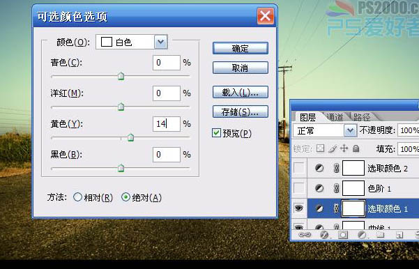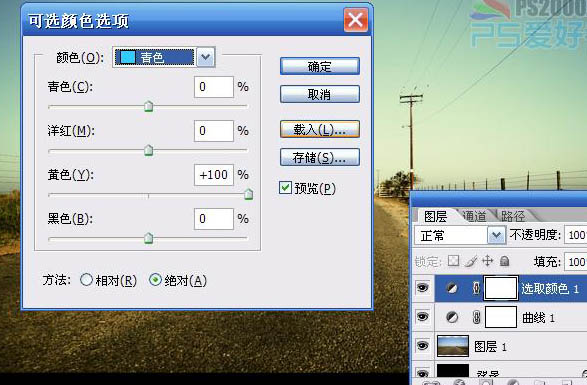 2、添加可选颜色调整图层(或者执行图层 > 新建调整图层 > 可选颜色),调整青色中黄色的数量为100%。