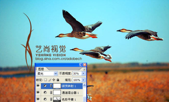 Photoshop打造漂亮的青红色大雁起飞图(4)
