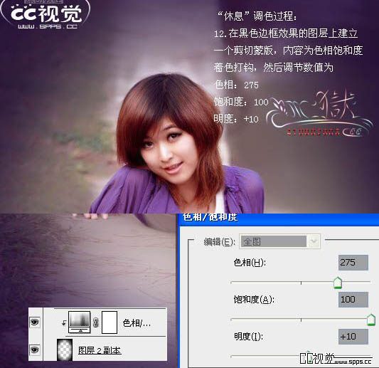12、在十二边框效果图层上建立一个剪切蒙版,内容为色相/饱和度,参数设置如下图。