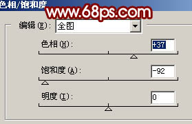 9、创建色相/饱和度调整图层,参数设置如图13。确定后把抠出的人物图层显示出来,按Ctrl + Shift + ] 置顶,效果如图14。