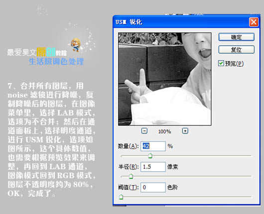 8、合并所有图层,用Noise外挂滤镜进行降噪处理,数值自定。复制降噪后的图层,在图像菜单里,选择模式 > Lab颜色。选择不合拼。然后在通道面板上选择明度通道,进行USM锐化,参数设置如下图。这个具体数值也需要更具预览效果来调整。再回到RGB模式,把图层不透明度改为:80%,完成最终效果。
