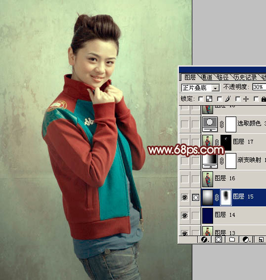 10、新建一个图层,选择渐变工具,颜色设置为黑白,有中心向四周拉出径向渐变。确定后把图层混合模式改为“正片叠底”,图层不透明度改为:30%,加上图层蒙版,用黑色画笔把人物脸部擦出来,效果如下图。