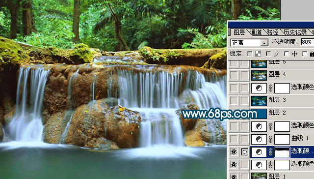 2、把可选颜色调整图层复制一层,图层不透明度改为:80%,用黑色画笔在蒙版上把顶部的树木部分擦出来,如下图。