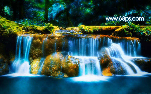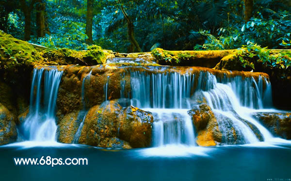 7、新建一个图层,盖印图层,用加深工具把边角部分稍微加深一点。再选择模糊工具把瀑布稍微模糊处理一下,效果如下图。