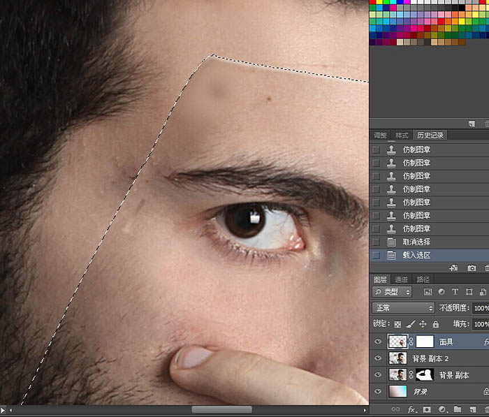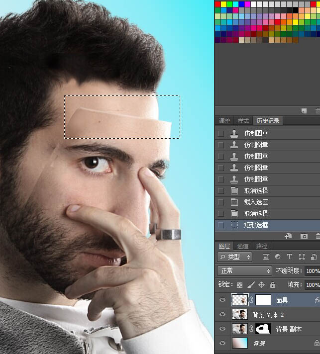 9、接下来,为了使面具看起来更逼真。首先选择矩形选框工具M,并拖动一个矩形上,像这样前额的顶部边缘。