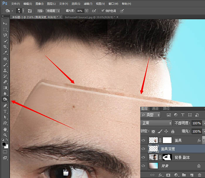 12、用加深工具,曝光度选择%30,为面具加深边缘。