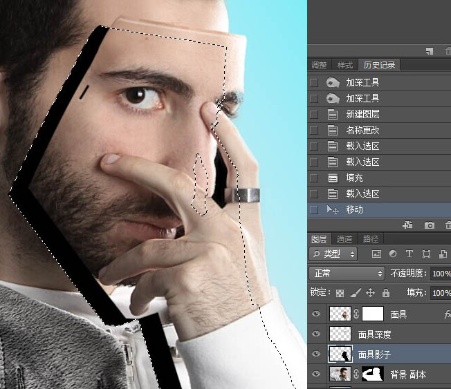 13、为面具加影子,新建一个图层,按住CTRL,鼠标点击面具图层形成选区,再点回面具影子图层填充黑色。