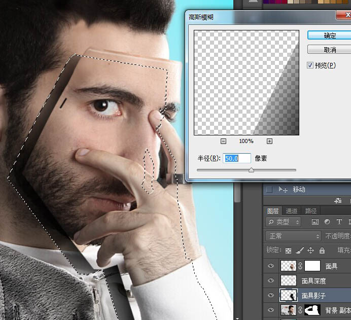14、滤镜-模糊-高斯模糊,给影子进行模糊,然后加一个蒙版,用画笔擦去多余的阴影。