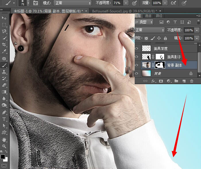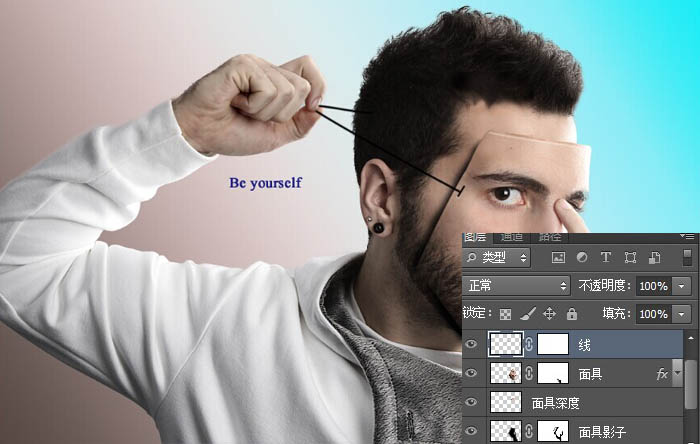 16、最后给面具描线,选择钢笔工具给面具画路径,然后右键描边路径要勾选钢笔压力。在添加蒙版擦去手指部分的线。这样就搞定了。