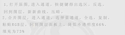 2、合并所有图层,点通道面板,选择蓝色通道,按Ctrl + A 全选,按Ctrl + C 复制。回到图层面板,新建一个图层,按Ctrl + V 粘贴,把图层不透明度设为:66%,填充设为:73%。