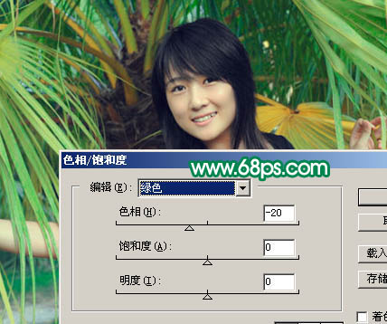 8、创建色相/饱和度调整图层,对绿色进行调整,参数及效果如下图。