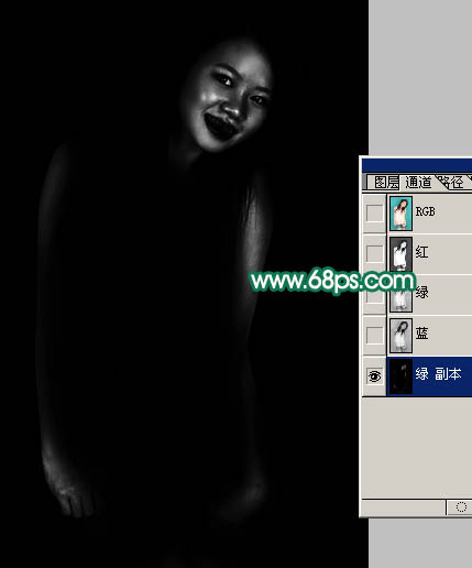 7、新建一个图层,盖印图层,把绿色通道复制一层,对绿色副本进行操作,用黑色画笔涂掉人物皮肤以外的部分,再适当用曲线调暗一点,效果如下图。