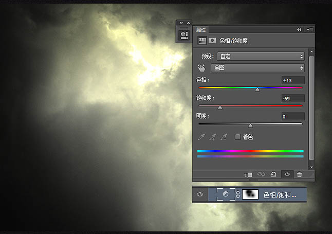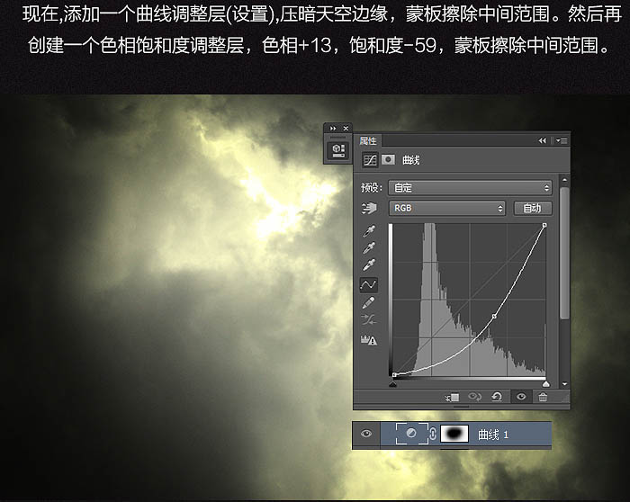 4、现在,添加一个曲线调整层,压暗天空边缘,蒙版擦除中间范围。然后再创建一个色相/饱和度调整层,色相+13。饱和度-59,蒙版擦除中间范围。