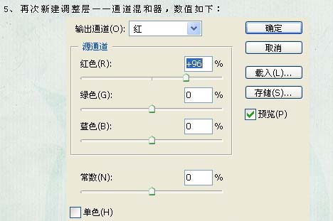 5、再次创建通道混合器调整图层,对红色进行调整,参数设置如下图。