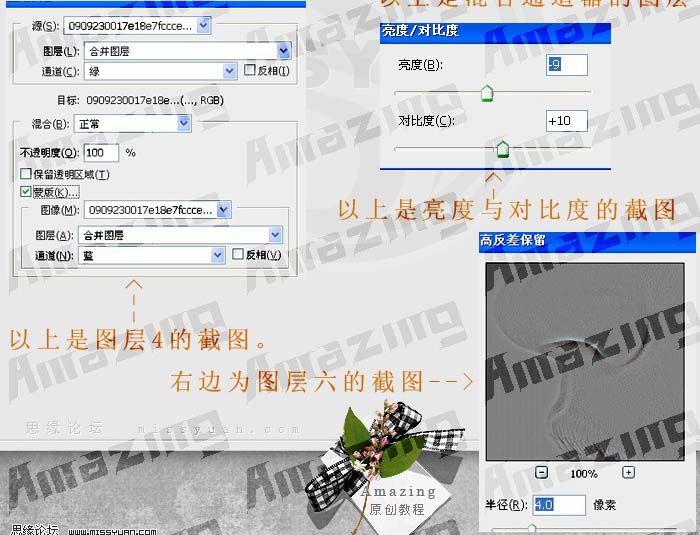 6、这步里有包含通道混合器和应用图像/亮度对比度/高反差的运用。